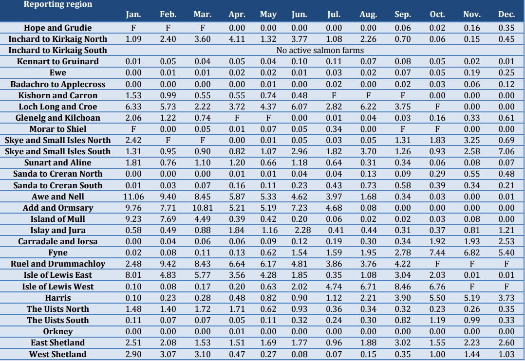According to Marine Scotland (pers comm, 2018) sea lice numbers peaked in 2015 and have been falling since. Quarterly Fish Health Management Reports based on the SSPO Fish Health Management System shows lice counts on a regional basis. The table below shows the average adult female lice count for each reporting region for 2016.