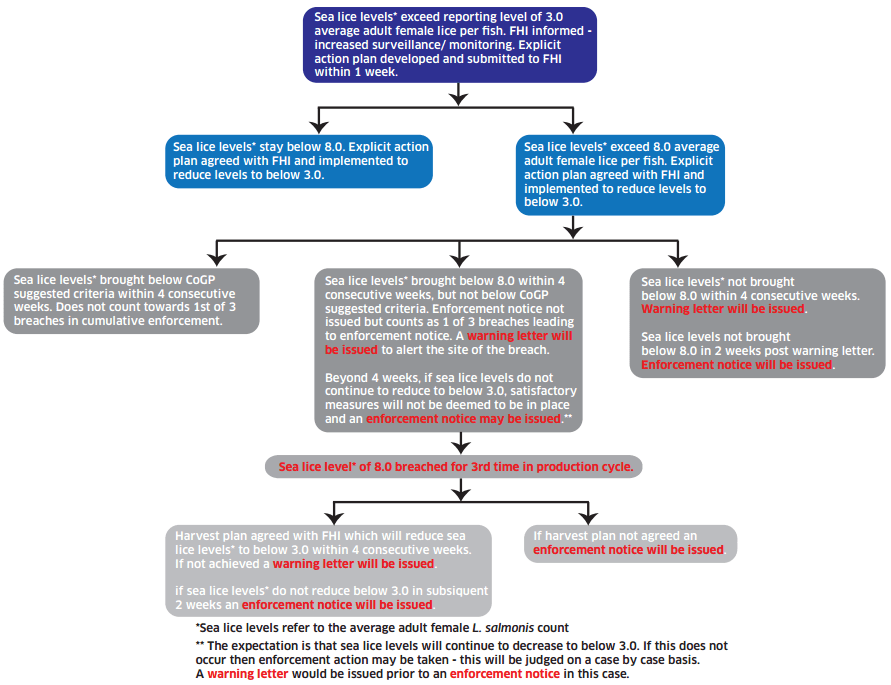 Reaching the reporting level or intervention limit requires the implementation of an explicit action plan, agreed with the FHI. This aims to reduce and maintain the average number of adult female sea lice per fish at the site below the reporting level of 3. If satisfactory measures cannot be demonstrated then enforcement action will be taken.
