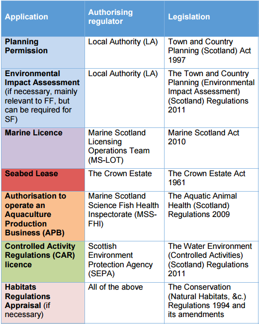 In order to set up a fish farm consent is required from Local Authorities, Scottish Environmental Protection Agency (SEPA), the Crown Estate, Marine Scotland licensing and MSS-FHI. Ongoing monitoring of fish farms during their operation is carried out by SEPA, the FHI and local authorities in relation to food production.