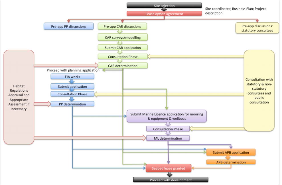 Taken from the Independent Review of Scottish Aquaculture Consenting1 (2016) the figure below summarises the current consenting process for salmon farming in Scotland.