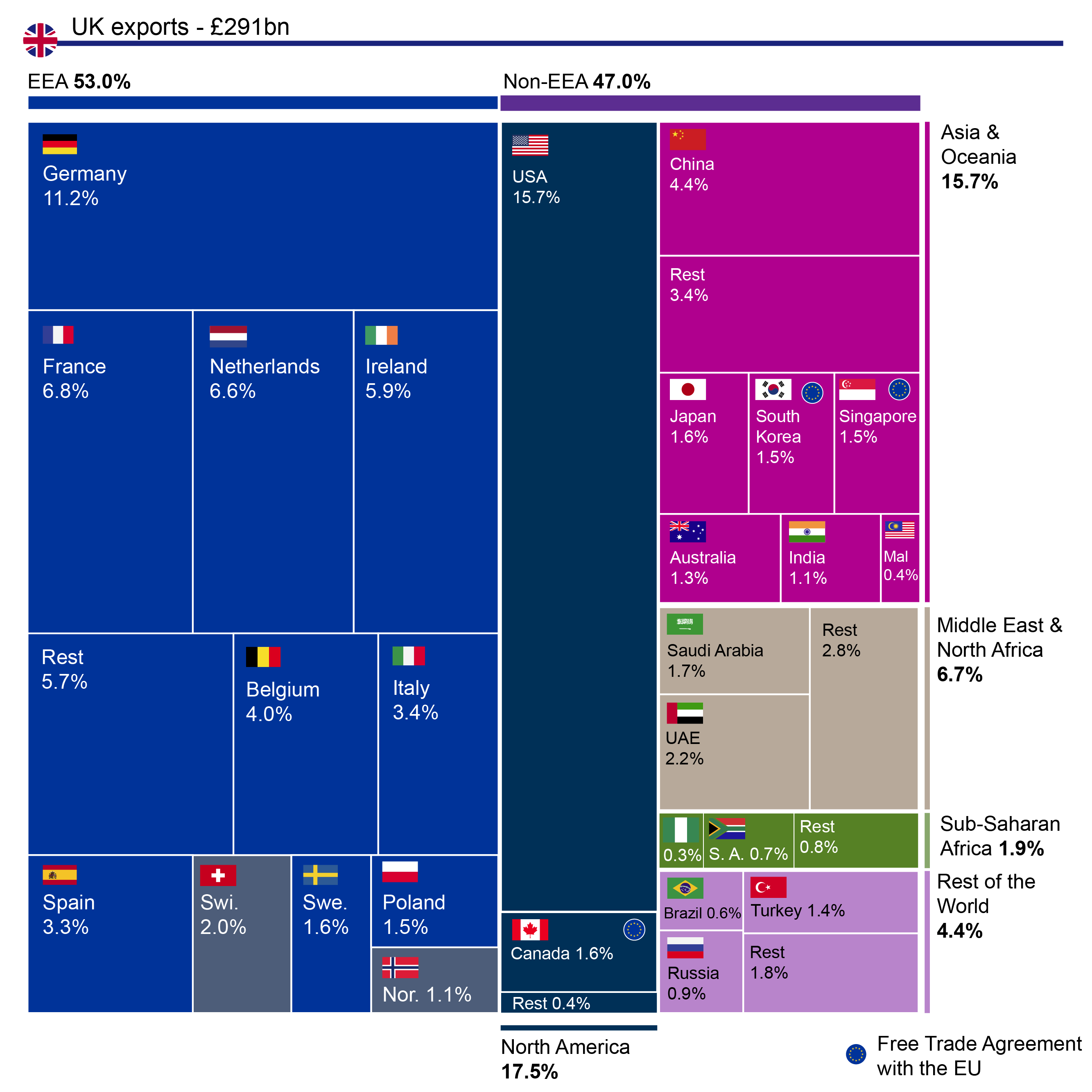 Otherwise, and apart from China, the UK's second-largest trading nation after the US, all of the UK’s trading partners individually account for less than 5% of the UK’s exports, though this share is likely to continue rising sharply, having already risen by about 60% since 2010. China has signalled its interest in securing a free trade arrangement with the UK post-Brexit. For instance Chinese ambassador to the UK Liu Xiaoming wrote an article in the Telegraph The UK-China ‘Golden Era’ can bear new fruit in advance of PM Theresa May's visit to China in January 2018.