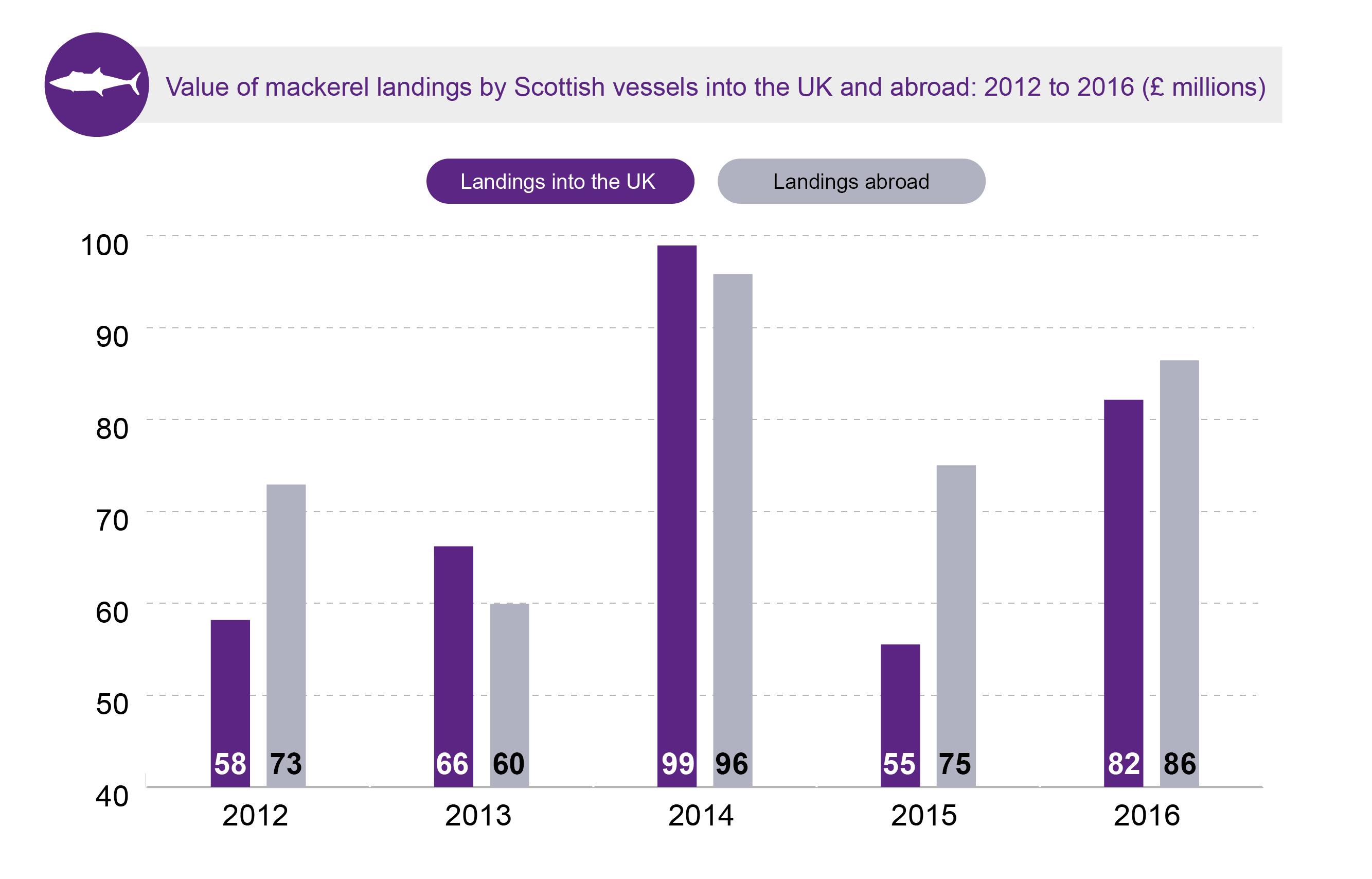 In 2016, 84% (£82m) of mackerel landed in UK ports were caught by Scottish vessels. Of the total value landed in the UK's ports, 94% (£92 m) was landed in Scottish Ports. £86.4 million of mackerel was also landed abroad by Scottish vessels.