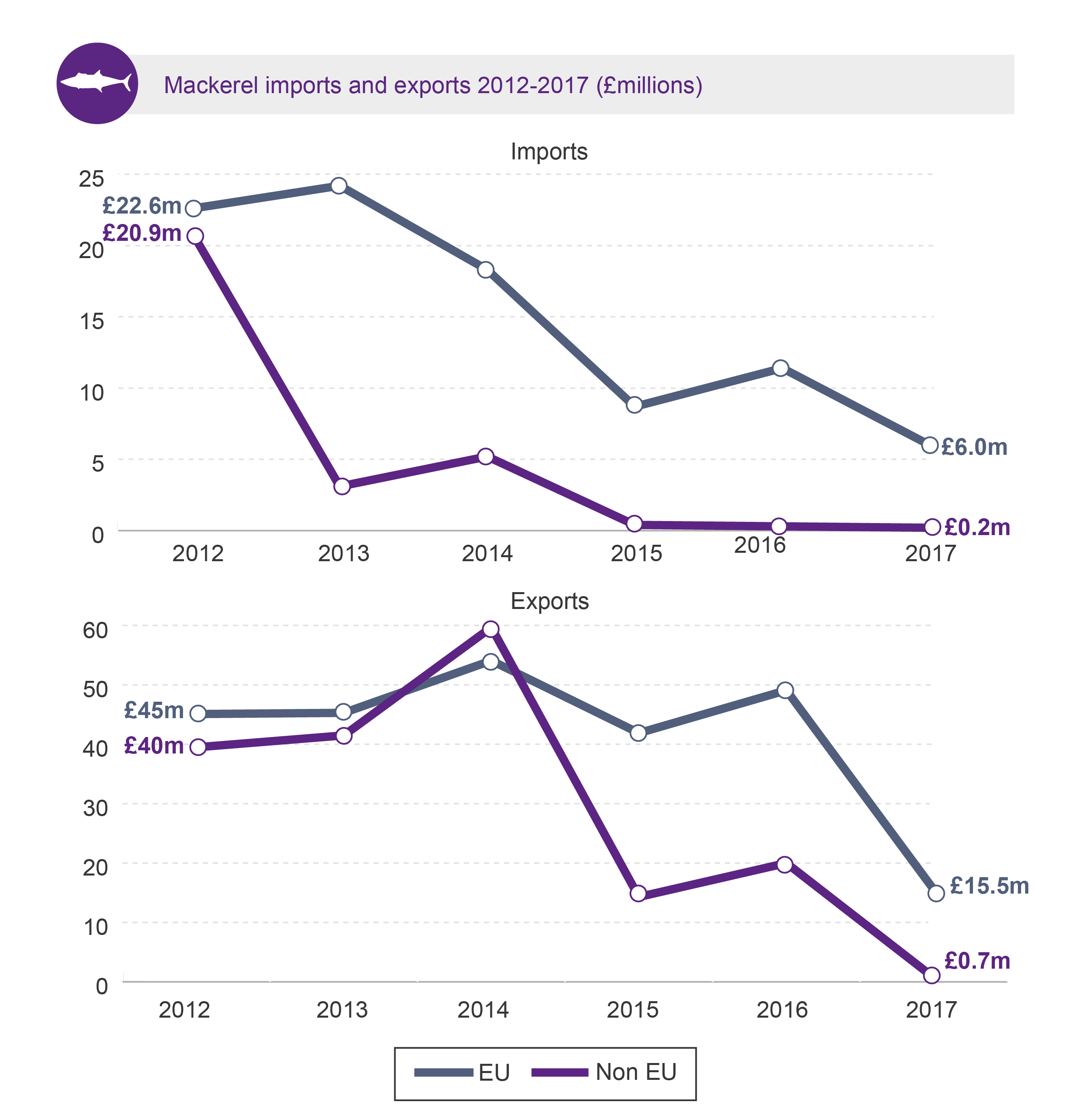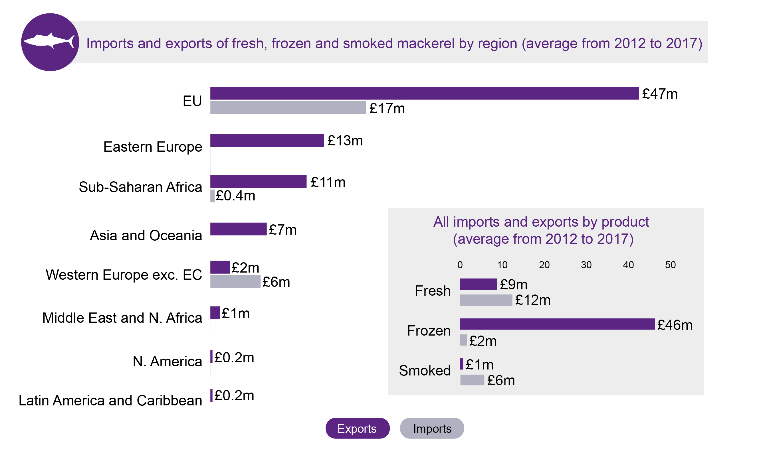 From 2012 to 2017, on average just under £42 million of mackerel was exported to the EU annually. The EU accounted for 59% (£251 million) of total exports of mackerel over the same period.