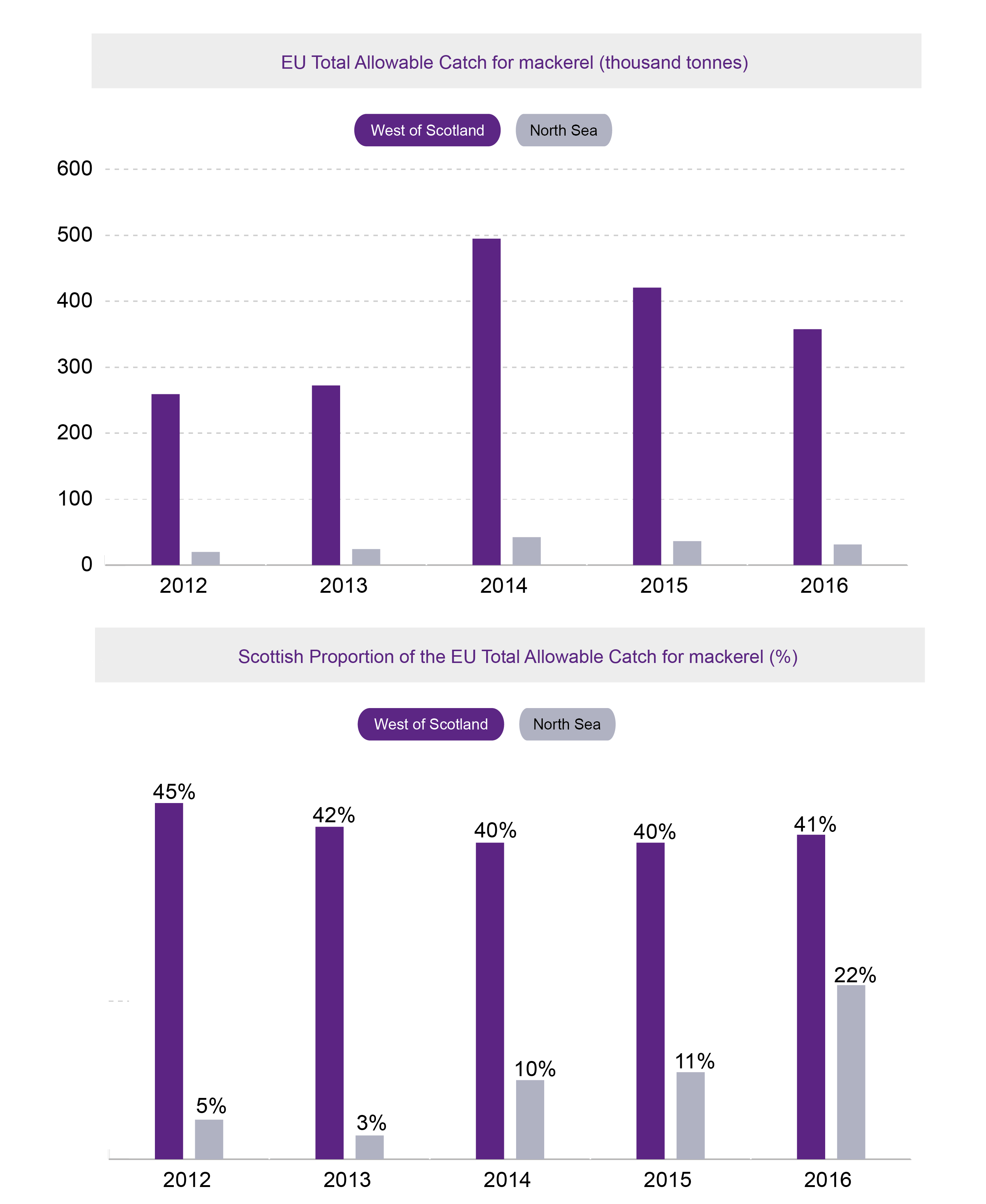 The figures below show the TAC for mackerel for the Western Scotland and North Sea regions and Scotland's share of the TAC between 2012 to 2016. Between 2013 and 2014 there was an increase in the TAC for North East Atlantic Mackerel following the 'Mackerel War' (see the following section).