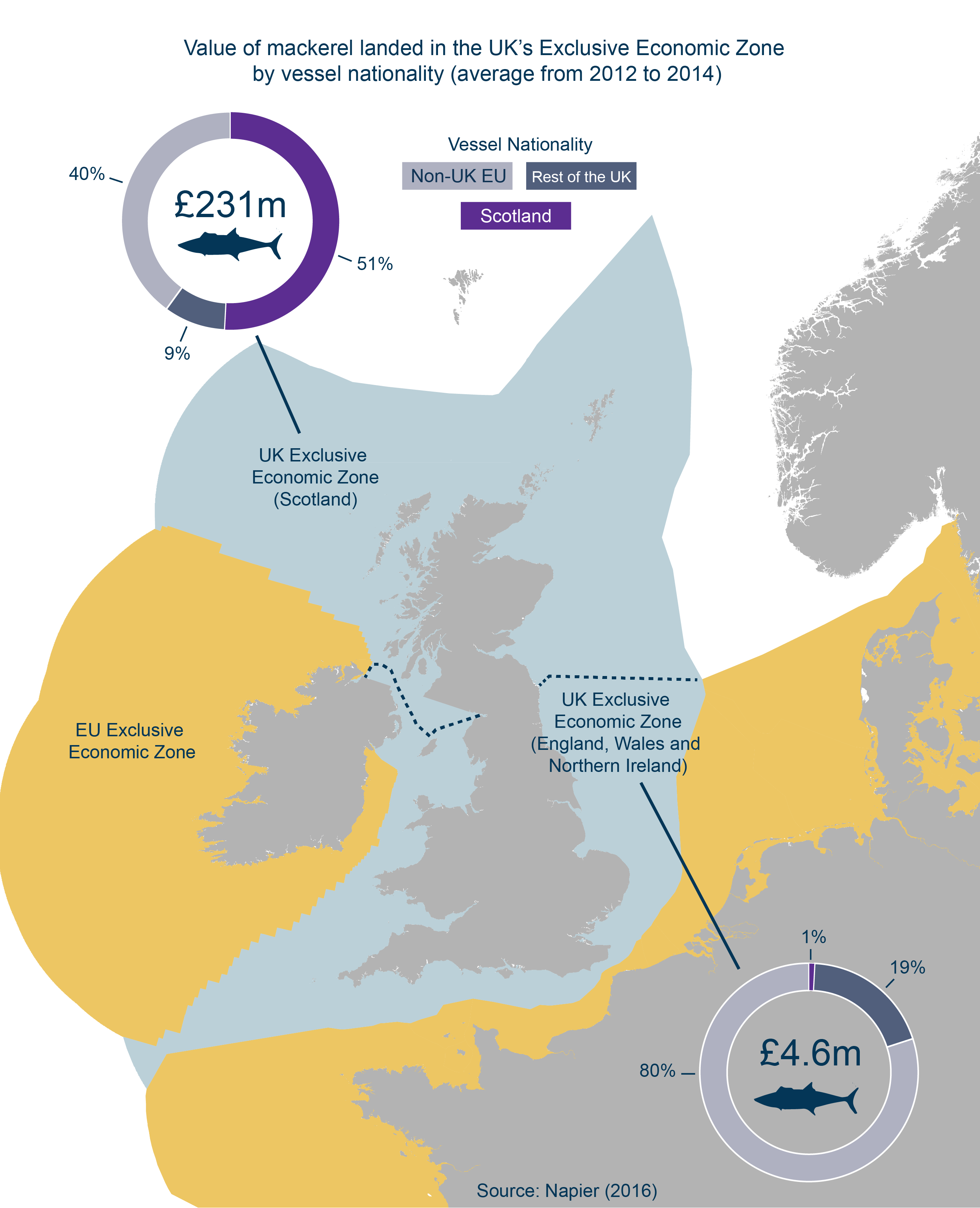 An Analysis of annual average landings in the UK's EEZ from 2012 to 2014 shows that 98% of mackerel landings were from the Scottish part of the UK's EEZ. Non-UK EU boats landed more than 110,000 tonnes of mackerel, worth almost £100 million, each year.