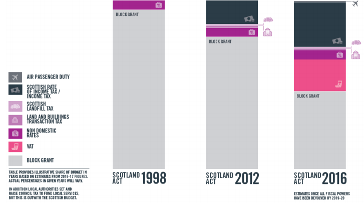 In recent years, new tax and welfare powers have been added to the Scottish Parliament's responsibilities. This will result in the Scottish budget moving from a situation where the vast majority of its discretionary spending power came from a block grant from Westminster (under Scotland Act 1998) to a situation where approximately half of the spending power of the Scottish budget comes from taxes raised in Scotland (under Scotland Act 2016).