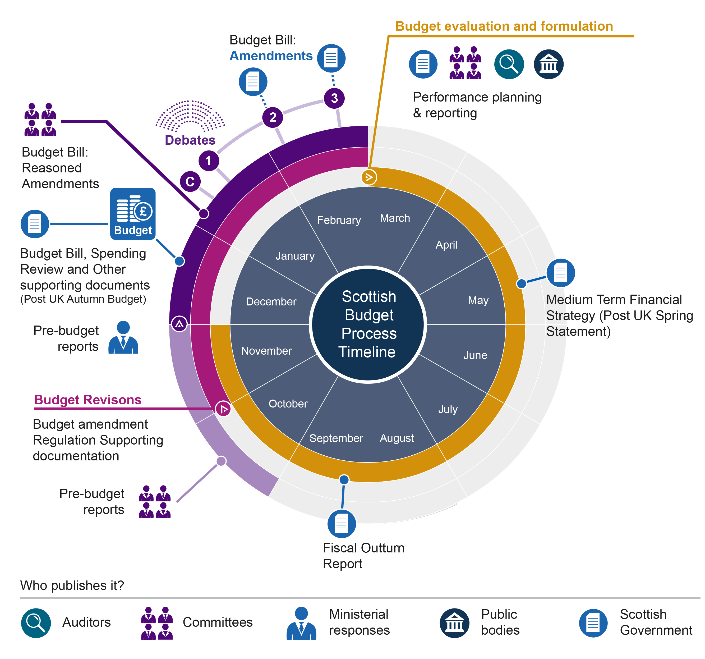 | Budget evaluation and formulation | Committees seek to influence the budget prior to firm proposals being published through constructive dialogue with ministers, public bodies and other stakeholders. This is based on evidence gathering, review and evaluation of existing policy priorities, how these are being funded and implemented and what is being achieved. This includes consideration of the financial, economic and policy context and should be a cumulative process throughout each session of the Parliament. | Medium Term Financial Strategy (Post UK Spring Statement) – SG. Fiscal Framework Outturn Report (September) – SG. Performance planning & reporting – SG, public bodies, auditors & Public Audit committee. |