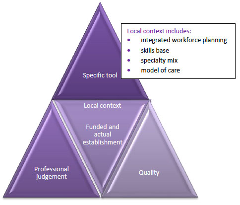 The work of the Nursing and Midwifery Workload and Workforce Planning Programme (NMWWPP) 1from 2004 onwards, led to the development, over a number of years, of a set of 12 workforce planning tools for nursing and midwifery, and a method for health boards to decide on an annual basis what the establishmenti should be for each nursing setting. The tools are based on an average workload for each specialty across Scotland, and are supplemented, in a triangulated approach by considering the specifics of local context - for example, the age profile of staff, local recruitment challenges; quality indicators and professional judgement.