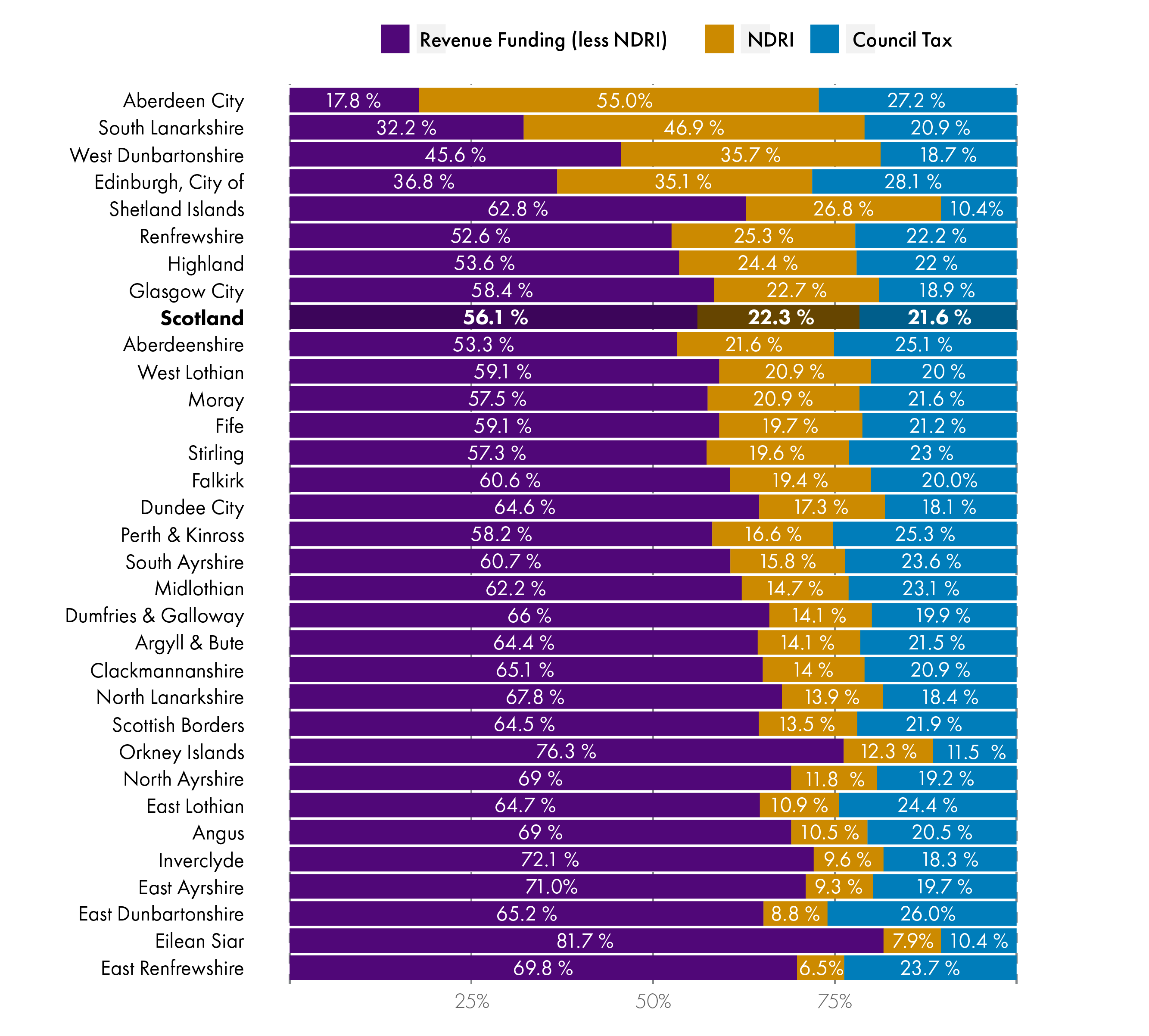 In 2019-20, Non-Domestic Rates Income will make up 22.3% of the funding for local authorities across Scotland. Council Tax will also make up an estimated 21.6% of the funding available. It's important to note, however, that the figures for individual councils vary widely: