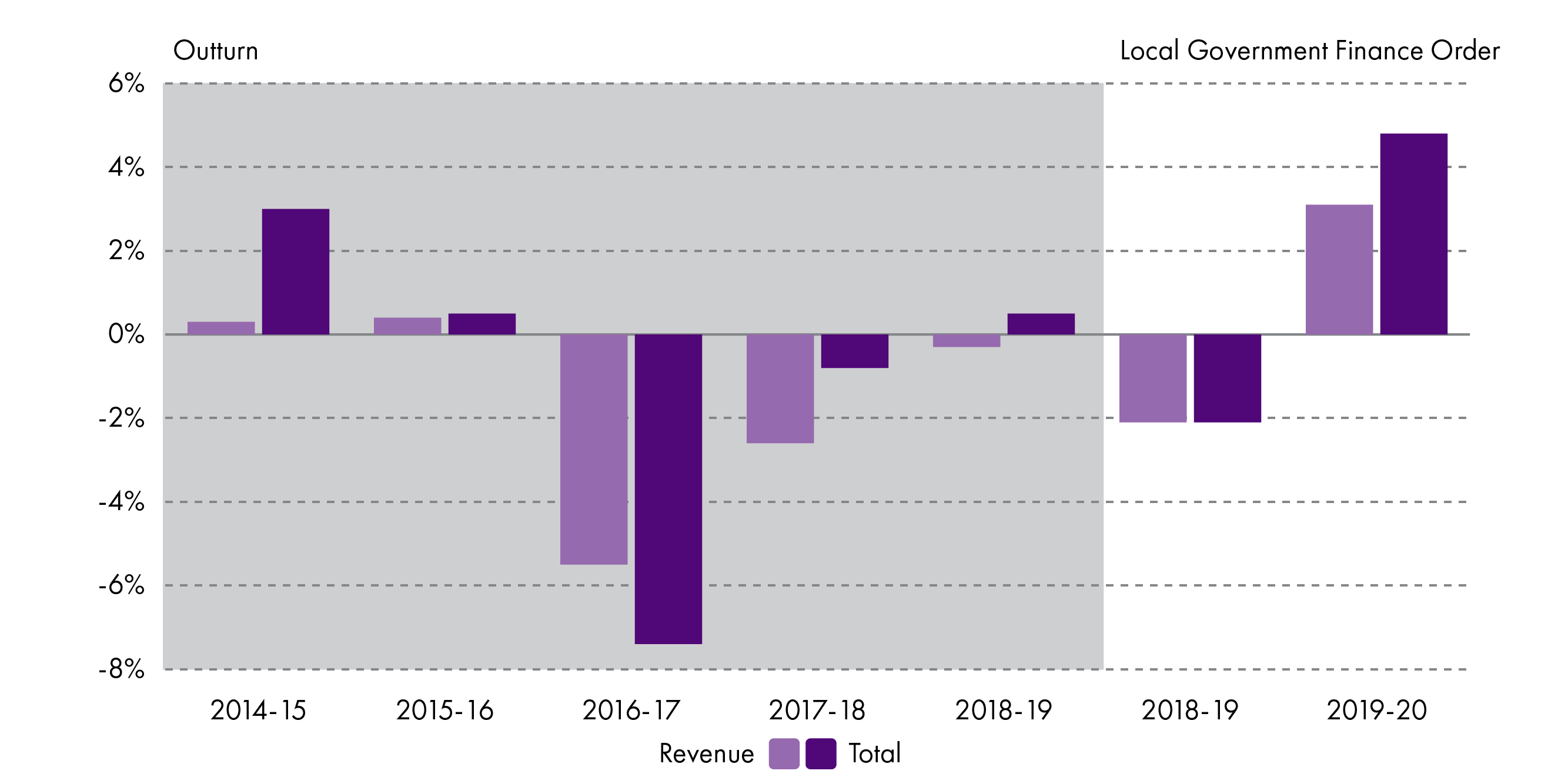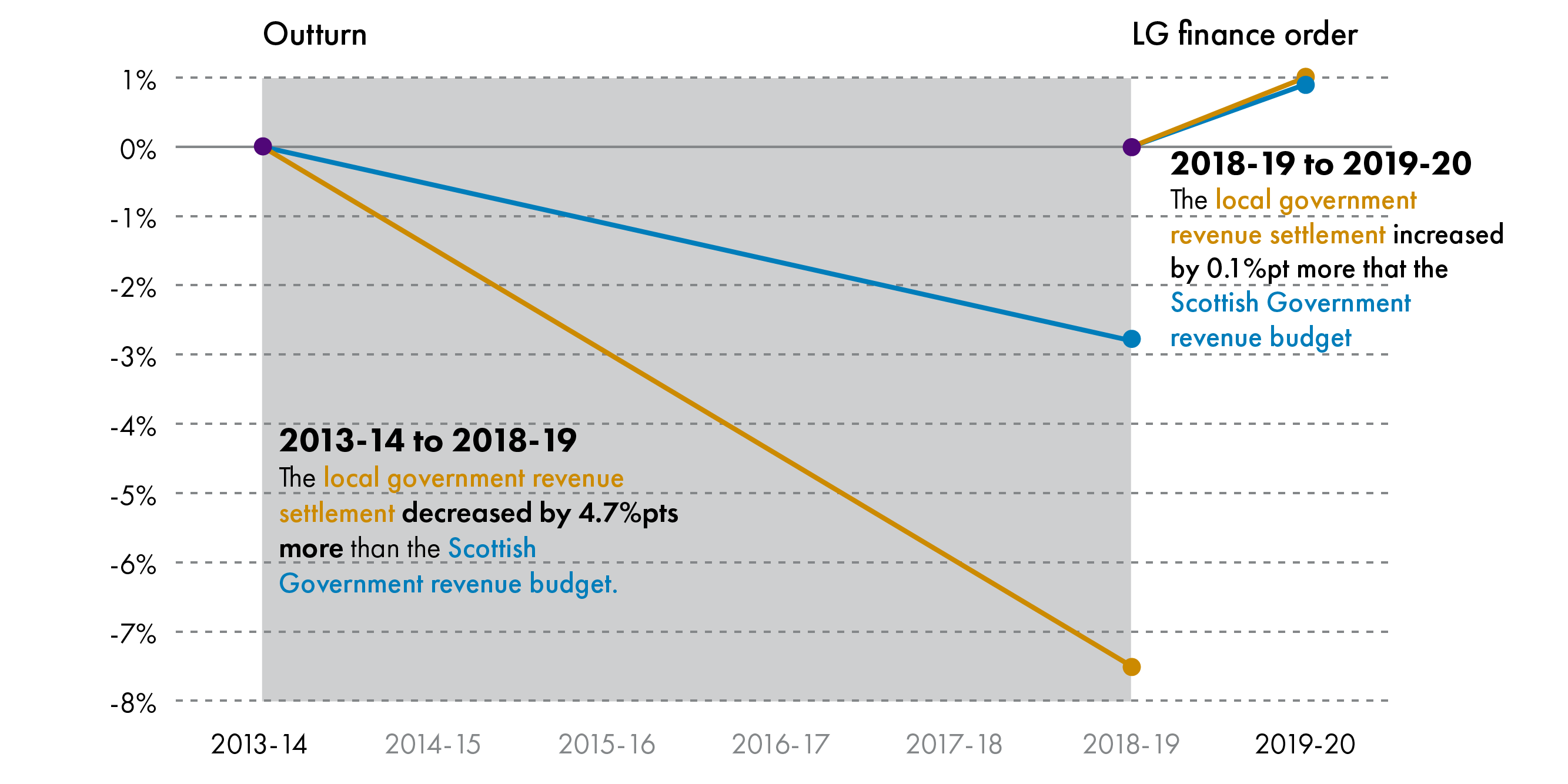 However, the trend is reversed when looking at the Local Government Finance Order figures for 2018-19 to 2019-20 - here the revenue settlement for local government increases by 1%, and the Scottish Government's revenue budget increases by 0.9%.
