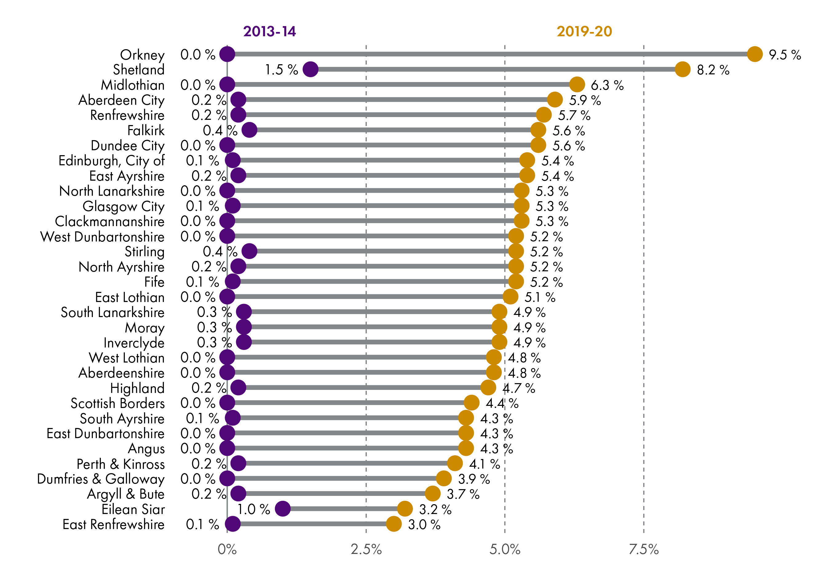 The island authority with the greatest percentage point change is Eilean Siar, with a 9.1 percentage point decrease between 2013-14 and 2018-19. Orkney has seen, by comparison, a 14.0 percentage point increase.
