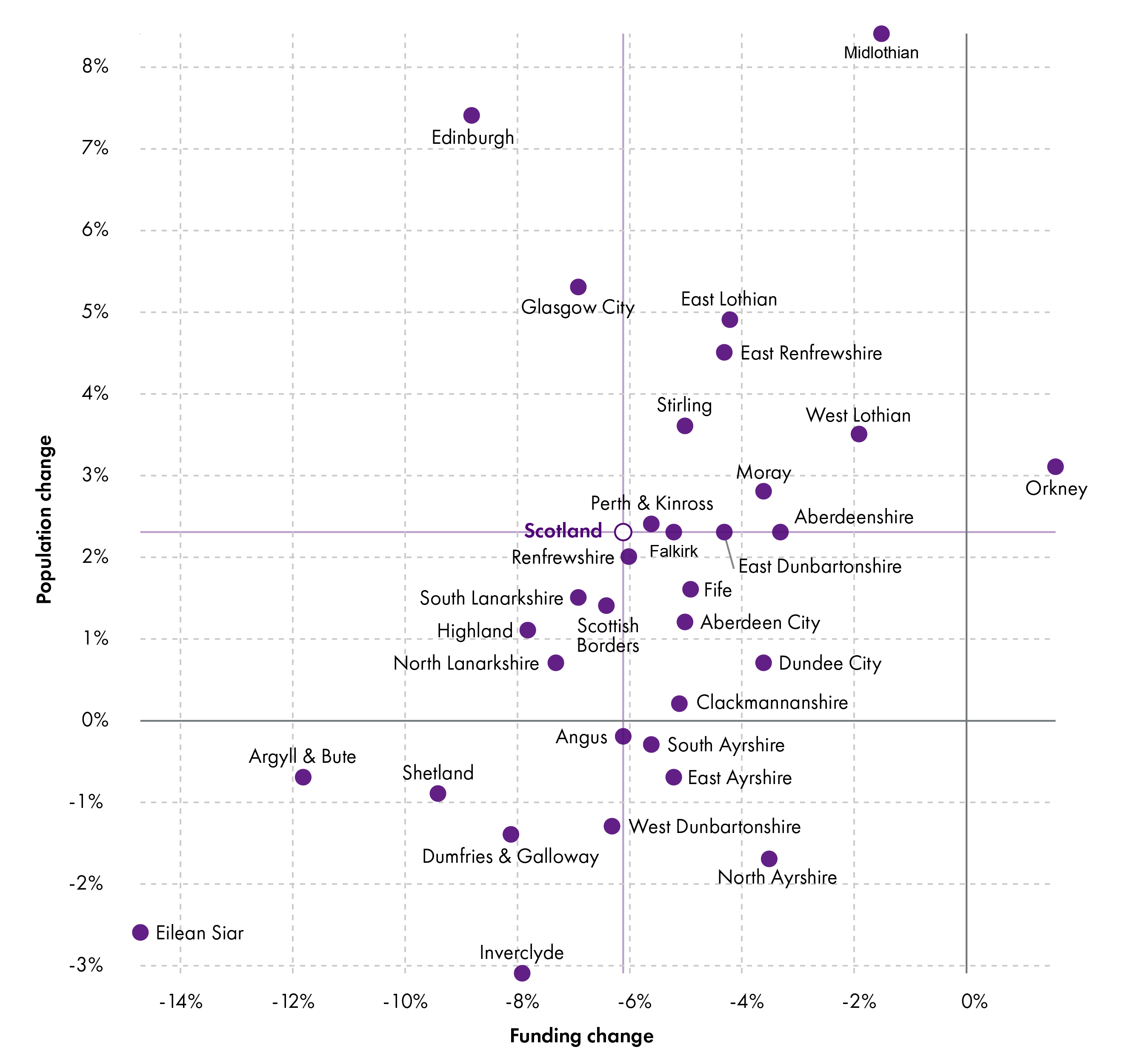 We can see here, for example, that Eilean Siar and Argyll and Bute have experienced not just a reduction in population, but a reduction in funding. Edinburgh’s population has grown significantly, as has that of Midlothian, but Edinburgh has seen a much higher reduction in funding per head. 22 of Scotland's 32 local authorities have increased population growth between 2013-14 and 2019-20, ranging from 0.2% in Clackmannanshire to 8.4% in Midlothian, but all but one of these local authorities (Orkney) has seen a reduction in real terms per head revenue funding.