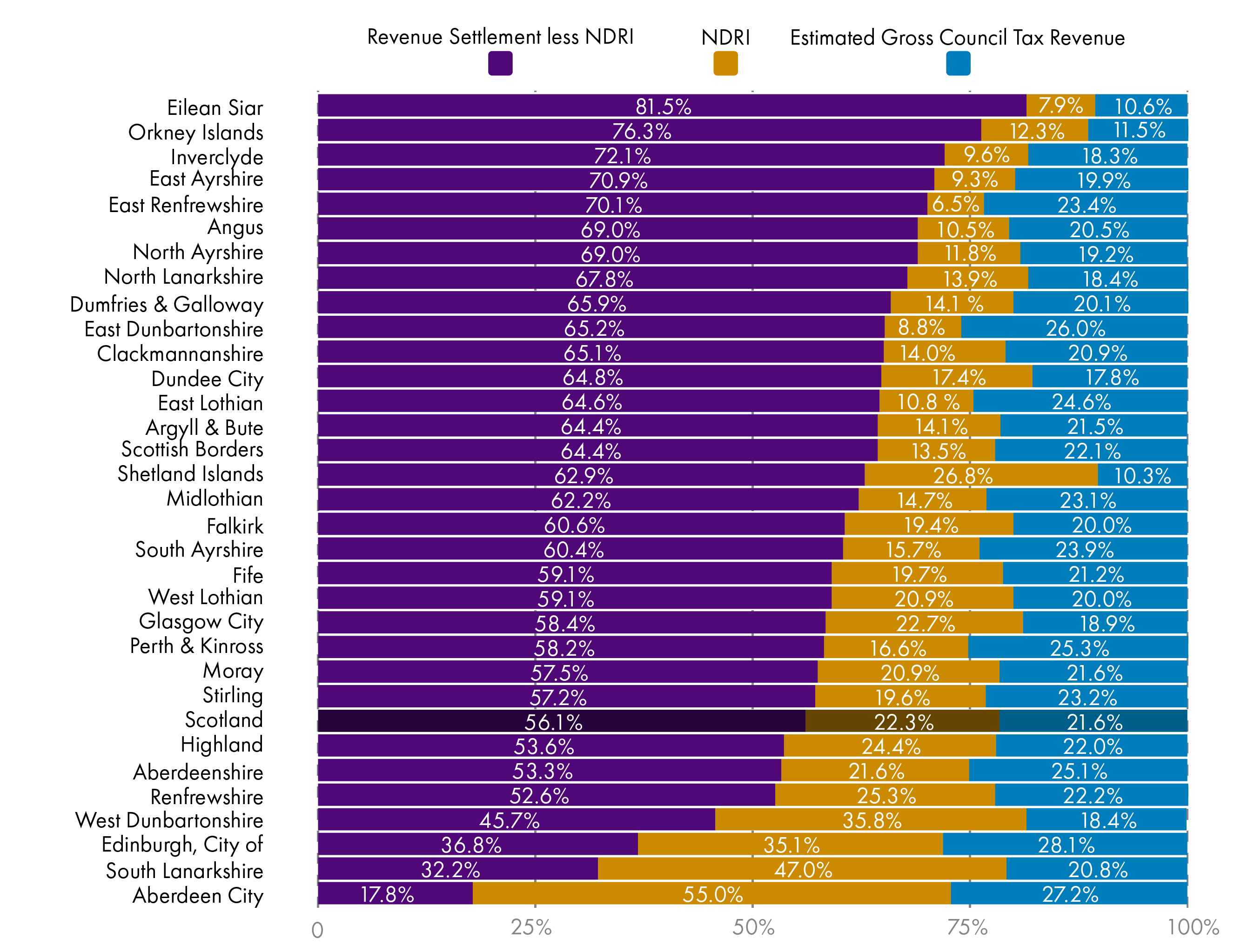 These figures serve to highlight the varying structure of local government revenue funding across local authorities. Some local authorities rely far more heavily on the revenue grant provided by the Scottish Government and have relatively limited ability to raise funding through taxation, and others see the majority of their funding coming from Council Tax and NDR Income.