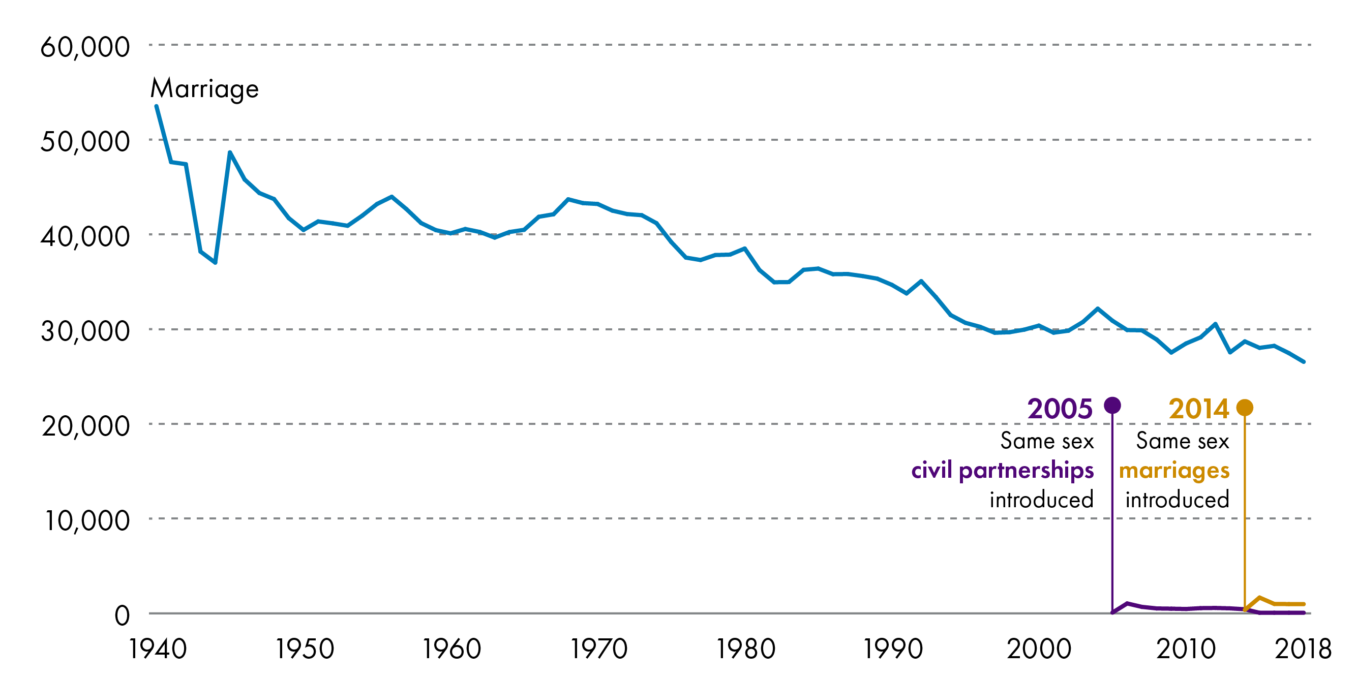 The table below shows the number of marriages and civil partnerships entered into each year in Scotland, since civil partnerships were introduced. There was an initial surge in civil partnerships when they were first introduced. When same sex marriage was introduced, this was the preferred option of same sex couples choosing to register their relationship.