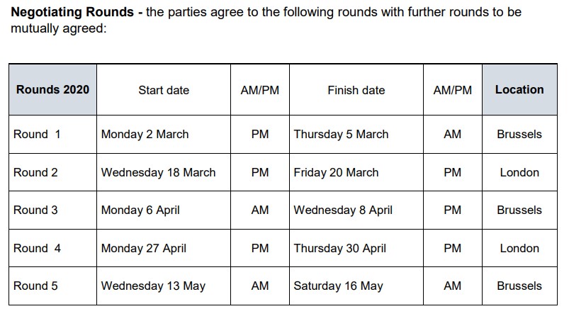 The second round of negotiations will take place 18-20 March 2020 in London with dates for three more rounds agreed in the negotiations' terms of reference.