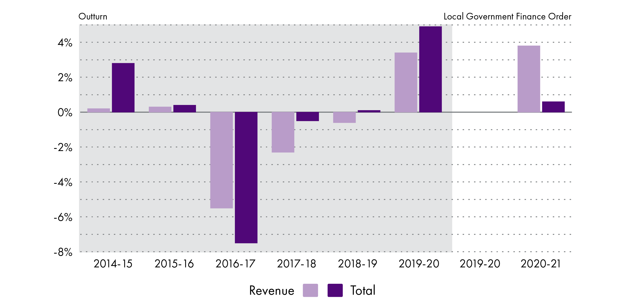 A common way of assessing and analysing the total local government budget is to look at the real terms change over time. Using the methodology outlined in the 2018 iteration of this briefing1, long-term comparisons up to 2019-20 are made using outturn figures (with 2013-14 as the baseline year), and Local Government Finance Order (LGFO) figures are used to explore the trend between 2019-20 and 2020-21. This is because a number of additional allocations are typically made in -year, so outturn and provisional figures are not comparable to one another.