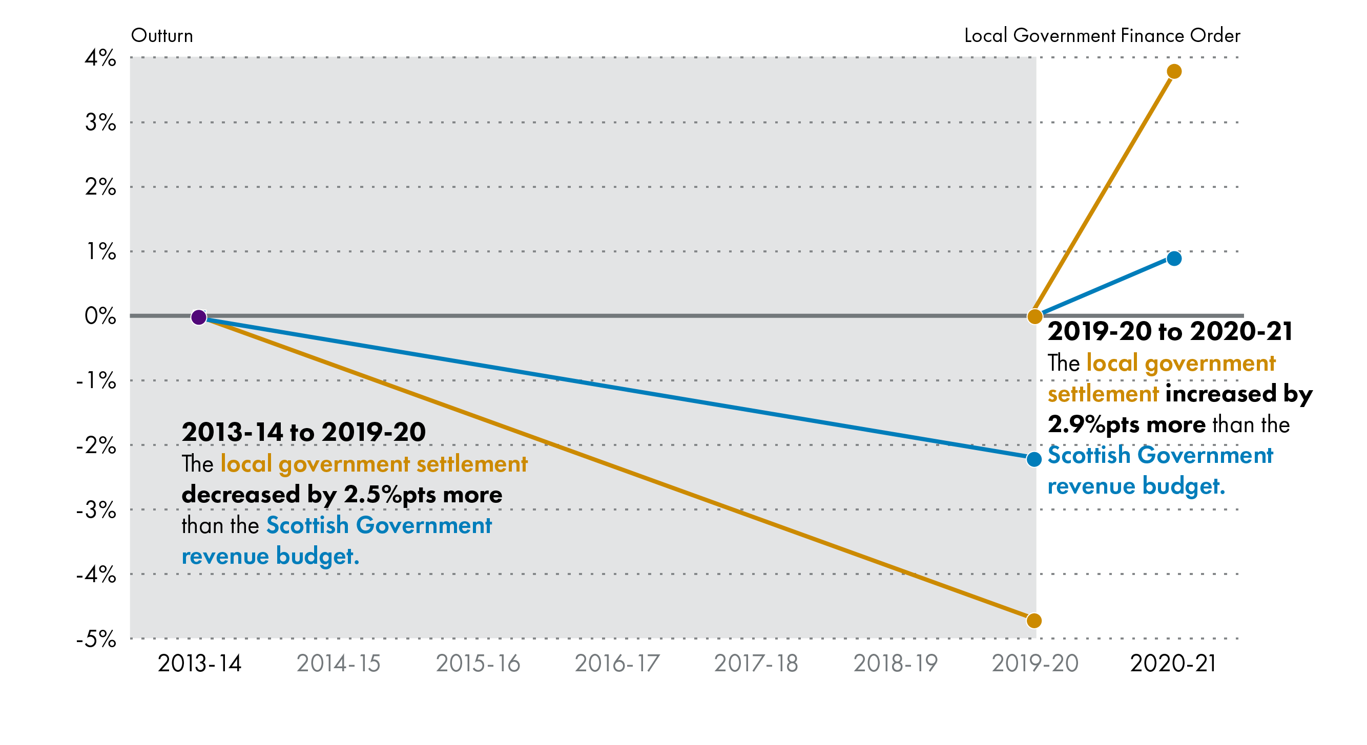 The local government revenue settlement as a proportion of the Scottish Government revenue budget decreased by 2.6 percentage points between 2013-14 and 2019-20. Local Government Finance Order figures show Local Government revenue as a proportion of Scottish Government revenue increasing between 2018-19 and 2019-20.