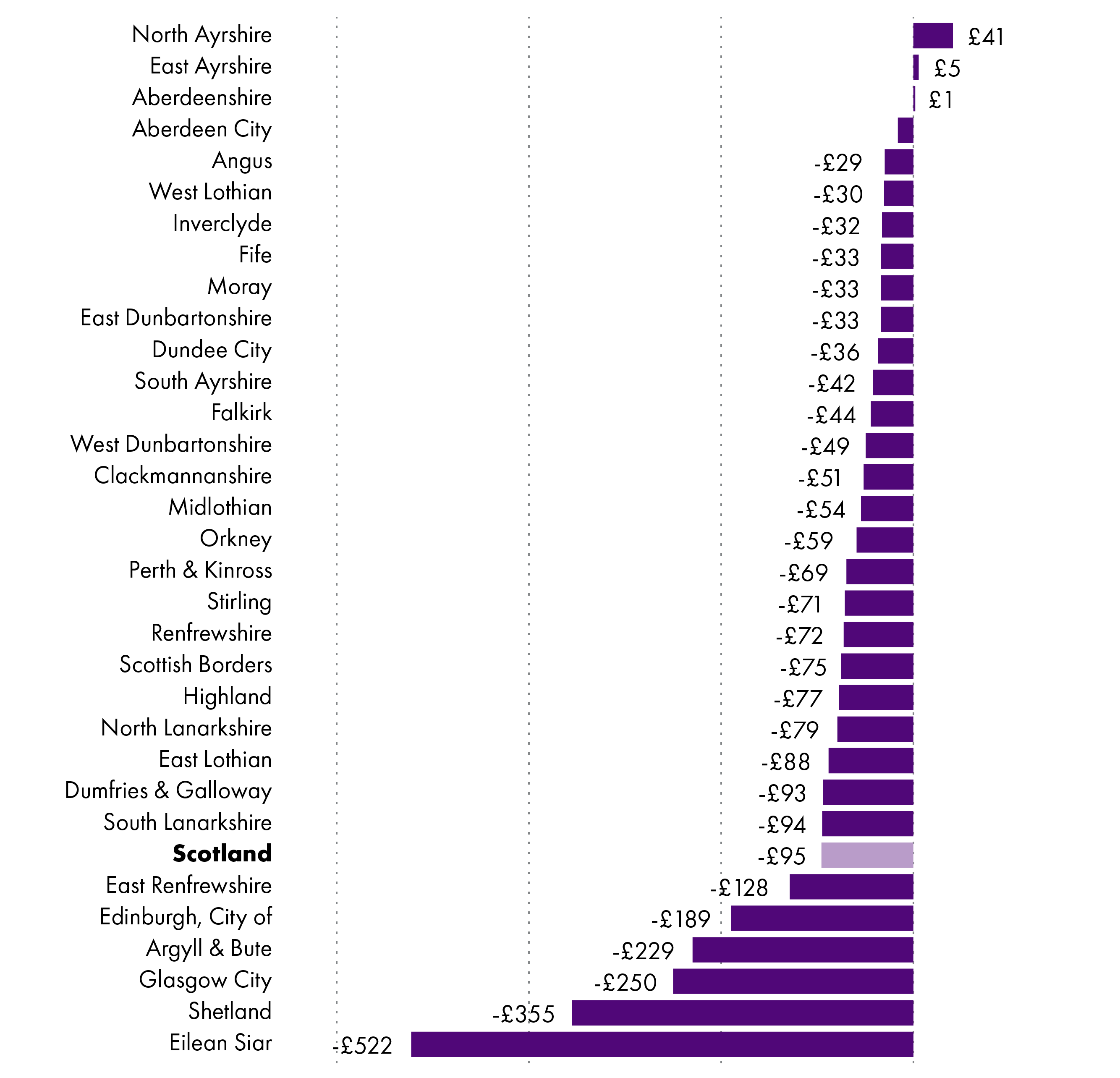 North Ayrshire (which has some islands) has seen the greatest increase to its real terms revenue funding per head, with a £41 increase between 2013-14 and 2020-21.