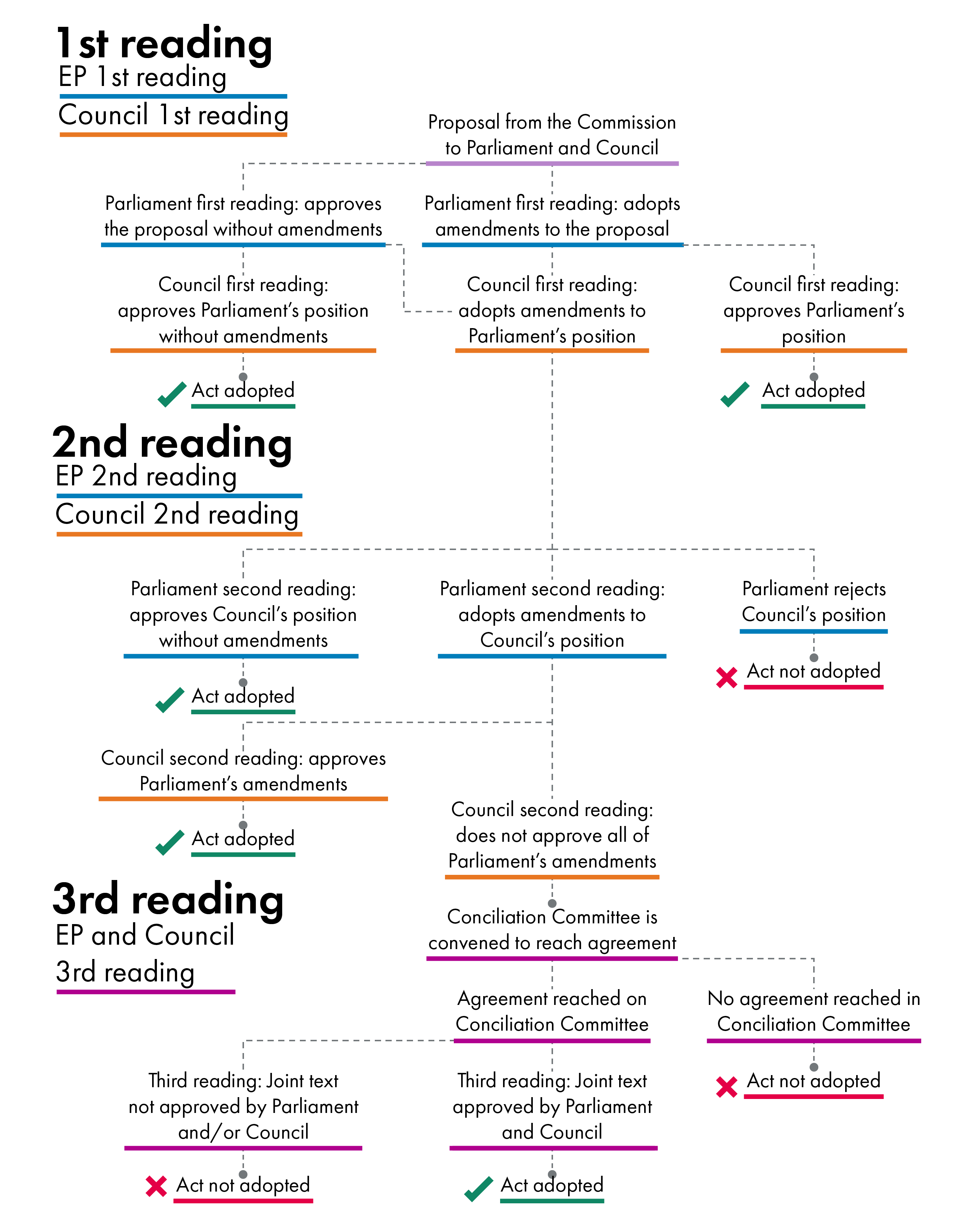 Once the Commission's legislative proposal has been finalised it is then up to the European Parliament and the Council of the European Union to take the proposal forward. Article 294 of the Treaty on the Functioning of the European Union (TFEU) describes how the Ordinary Legislative Procedure applies.